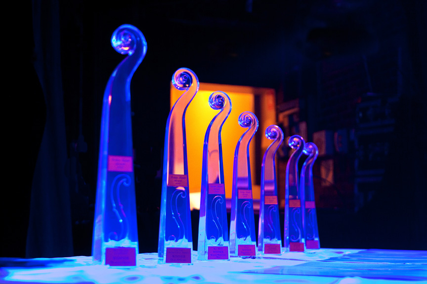 The actual Golden Fiddle Award is based on the anatomy of a violin – a clear, square and transparent resin mould at the base, standing 40cm high and ending with a violin scroll. They are appropriately labelled and presented on stage during the annual Golden Fiddle Show.